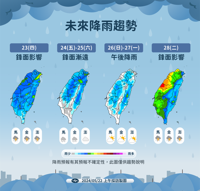 由於鋒面位於臺灣上空,明(23)日各地有機會出現短暫陣雨或局部雷雨,尤其午後降雨較爲明顯,東半部地區及西半部山區有機率出現局部大雨。氣象署表示,下週二、下週三(28日、29日)另一波結構較好的鋒面伴隨較強的西南風,西半部及東北部地區有短暫陣雨或雷雨,其中西半部有局部大雨發生的機率,其他地區也有局部短暫陣雨或雷雨。