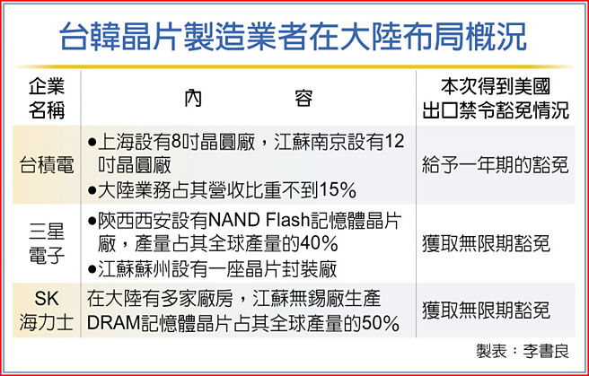 報導稱,三星電子與SK海力士都是記憶體晶片生產巨頭,臺積電則是全球晶片代工製造業霸主,三家臺韓業者都在大陸建立生產基地,由於美國禁令將對三家企業在大陸的經營及營收造成影響,三星與SK海力士甚至曾一度考慮將工廠遷出大陸。
