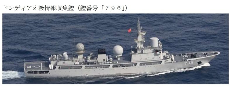 日本防衛省稍早也公佈,今天上午9點左右,日本自衛隊在沖繩縣久米島西方約100公里海域,發現發現隸屬中共海軍北海艦隊的815型電子情報船「天權星號」(舷號796),穿過沖繩本島及宮古島之間的海域往東南方向航行,隨後進入太平洋,日本海上自衛隊派出P-3C巡邏機升空監視。