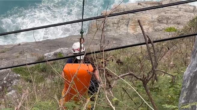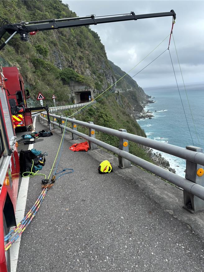 有民衆今中午報案指蘇花公路和清隧道100米深邊坡疑有人受困,花蓮縣消防局派遣車組前往救援,架設繩索接觸患者時,人卻已明顯死亡。(花蓮縣消防局提供/羅亦晽花蓮傳真)