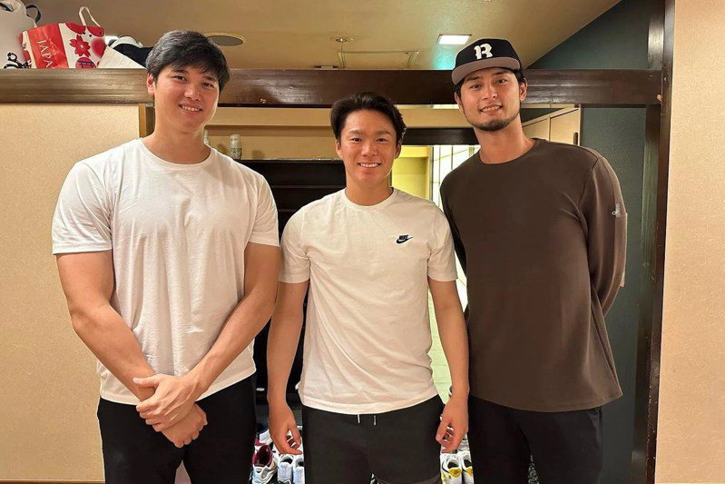 一起征戰棒球經典賽的大谷翔平(左)、達比修有(右)、山本由伸,3人在道奇教士比賽前相談甚歡。圖取自山本由伸IG