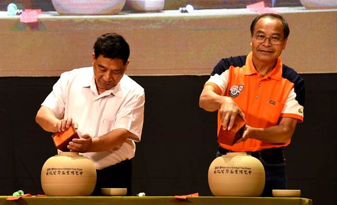 ▲茶博閉幕,在大家見證下,由副縣長陳正升(左)與鹿谷農會理事長陳文義一起爲2019茶博會活動的茶葉進行裝罐封茶,象徵活動的延續與保存。(楊樹煌攝)