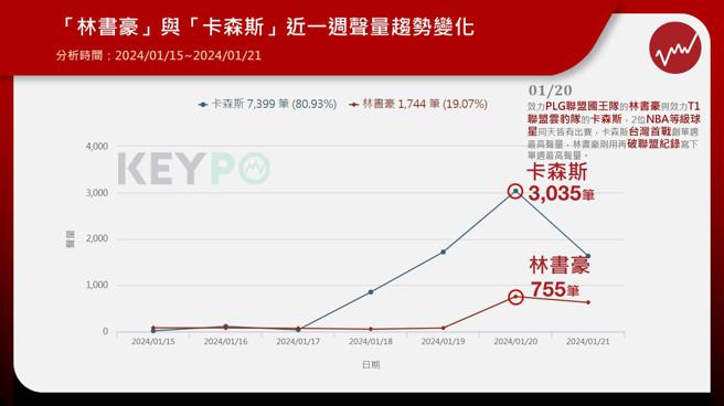 透過《KEYPO大數據關鍵引擎》輿情分析系統,觀察「林書豪」和「卡森斯」近一週聲量趨勢變化,前者累積聲量1,744筆,後者則爲7,399筆。兩人20日同天出賽,各自累積755筆與3,035筆聲量,都成爲一週內單日聲量最高峰,雖然「表弟」首場表現普通,處女秀新鮮感仍讓他討論度高過林書豪出色表現。