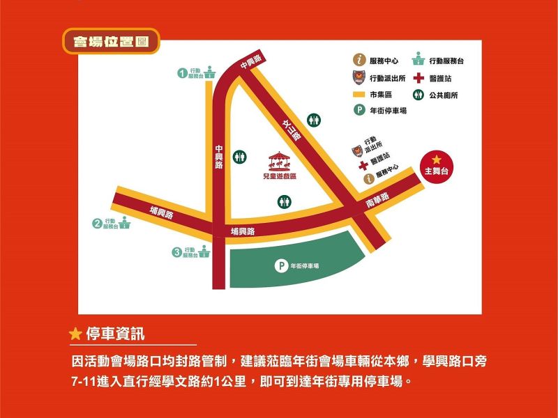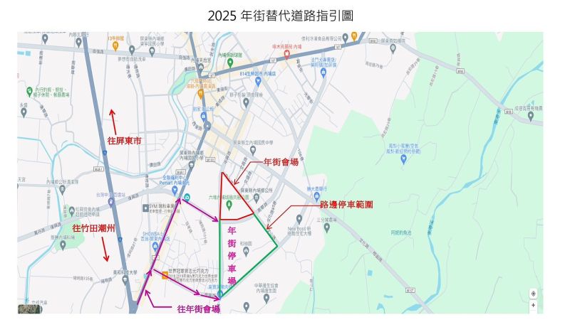 另內埔鄉公所旁邊的「內埔年街」活動,公告中興路、埔興路、文山路、南華路、文昌路、文盛路、文忠路、文昌路72巷等,爲行人徒步及攤販區,另在學文路、和興路上的「和禎園」,規劃年街專用大型停車場,約可停放500輛左右自小客車,聯外道路均有指示牌引導前往。至於「六堆客家文化園區」及「臺灣原住民文化園區」,也都有提供停車場服務,請各位駕駛朋友能發揮耐心,聽從現場工作人員及員警交通指揮。