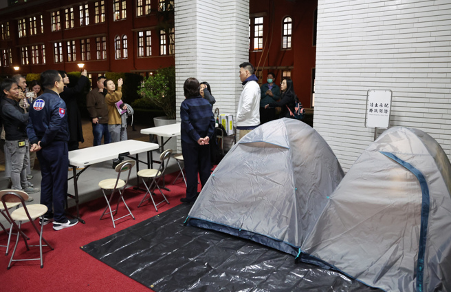 立法院17日院會結束後,國民黨立委在議場大門前搭起帳篷準備接力過夜,力拚20日院會處理「公職人員選舉罷免法」、「憲法訴訟法」、「財政收支劃分法」修正草案能過關。(姚志平攝)