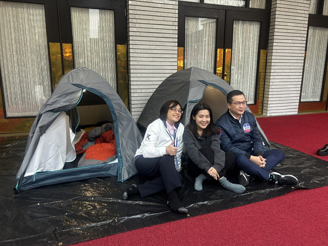 國民黨立委羅智強(右起)、徐巧芯、林倩綺開始在立院議場門口排隊守夜。(陳薏雲攝)
