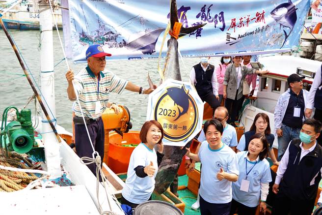 「第一鮪」拍賣會7日下午在東港魚市場熱鬧登場,琉球籍「新發財1號」漁船船長洪明全將第一鮪吊上岸後,由副總統賴清德、屏東縣長周春米一同秤重,宣佈今年屏東「第一鮪」身長202公分、重186公斤,隨後進入拍賣程序。