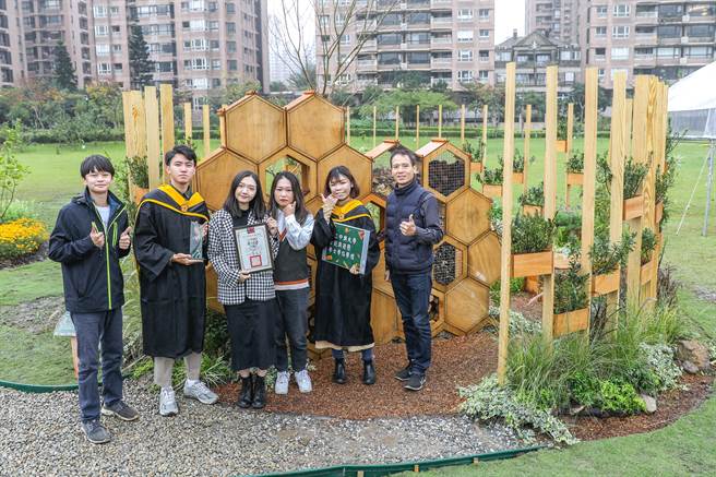 榮獲第一名的中興大學與逢甲大學團隊表示,作品「大地蜜語」從蜜蜂的角度爲出發點,以蜂巢概念傳遞生態平衡理念(景觀處提供/戴上容新北傳真)