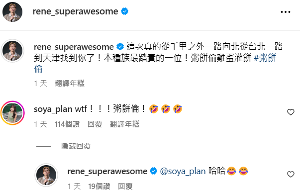 ▲Soya在超強的貼文底下留言。(圖/翻攝自Instagram/rene_superawesome)