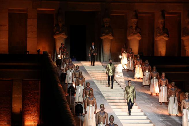 大秀一開場,由義大利國寶級男高音安德烈波伽利獻唱,他身穿一襲Stefano Ricci爲他量身訂製的白色絲綢禮服,高唱歌劇《阿依達》的第一幕羅馬舞曲「Celeste Aida」,隨後模特兒緩緩步下神殿階梯,階梯兩側站立着古埃及衛兵,伸展臺的背景則是神廟高聳入天的25尊巨型雕像,場面壯觀,令人屏息。