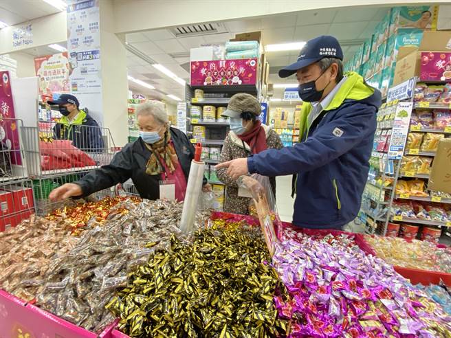 臺電志工陪着長者們選購應景的年節糖果,並一一詳細介紹。(於家麒攝)