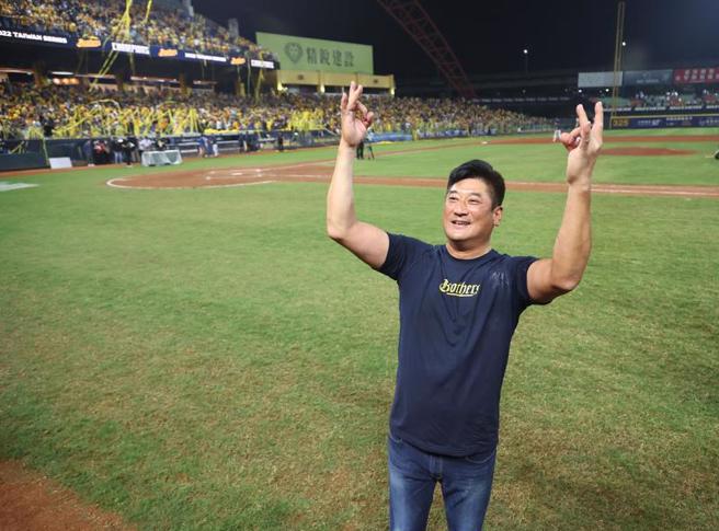 中華職棒中信兄弟隊9日晚間在2022年度總冠軍賽中,以4連勝之姿成功連霸,奪得隊史第9座總冠軍,賽後中信球團董事長辜仲諒也開心在場邊比出手勢,期待明年繼續3連霸。(中央社)