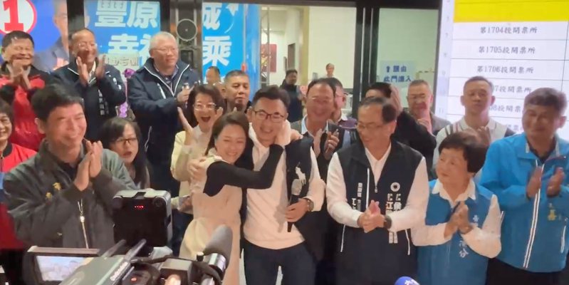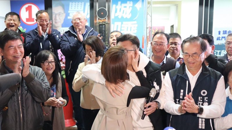 臺中市第八選區國民黨立委候選人江啓臣順利4連霸,晚間發表當選感言,謝謝支持者和競選團隊,最後感謝身旁妻子劉姿伶,照顧家人還幫他跑行程,「我真的要特別感謝她」,劉在旁感動頻頻拭淚,激動處更雙手捧江臉頰、嘴對嘴親吻,現場放閃、冒出粉紅泡泡,支持者高聲呼喊、拍手。