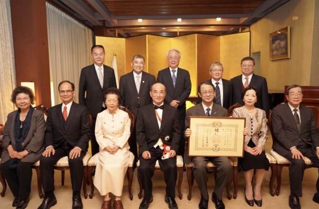 針對高雄市長選戰,白派大老的前立法院長王金平(前排中)今(2)日早上邀集今早在路竹老家,邀集高雄市議會副議長陸淑美、高雄市農會理事長蕭漢俊(後排右三)及臺灣螺絲公會理事長蔡圖晉(後排左二)等人開會討論輔選事宜。圖爲今年3月王獲日本政府頒綬「旭日大綬章」。(柯宗緯翻攝)