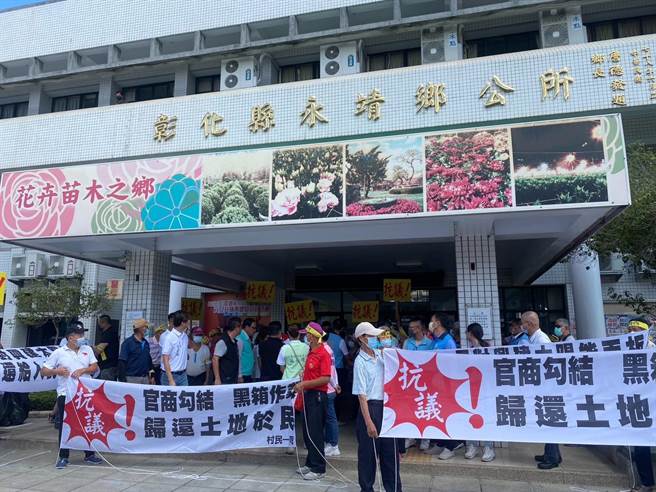 今天近百位村民在福興社區發展協會理事長凃柏任帶領下,頭綁「黑箱作業」、「官司勾結」黃布條,前往永靖鄉公所廣場呼口號抗議,遞交陳情書。