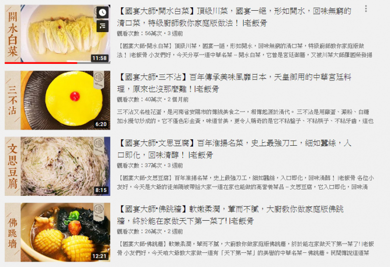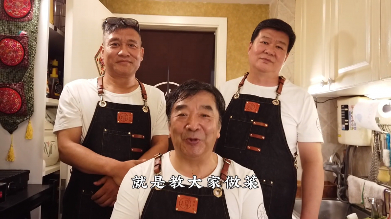 這3名大叔一起合體在家拍影片,教大家做美味的家常菜和正宗北方菜,傳授幾乎失傳的老手藝,包含了「開水白菜」、「三不沾」、「油潑豬手」、「汗蒸魚」等功夫料理。實際點開「開水白菜」,湯的部分不僅要先用雞肉、豬肉「吊湯」,除去雜質後再送進高壓鍋,把精華熬出來後再放回爐子上煮,隨後還要加入剁碎的雞蓉煮滾,過程中依舊不斷地去掉浮沫,最後才能呈現出一整鍋清澈的鮮湯,雖然是在家中的小廚房做,但是步驟絕對不馬虎。